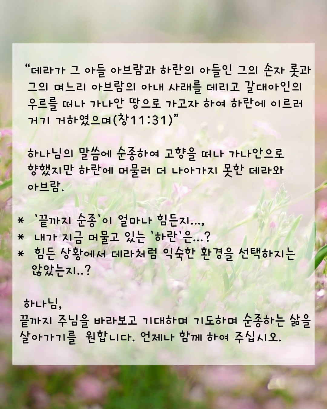 하나님의 말씀에 순종하여 고향을 떠나 가나안으로 향했지만 하란에 머물러