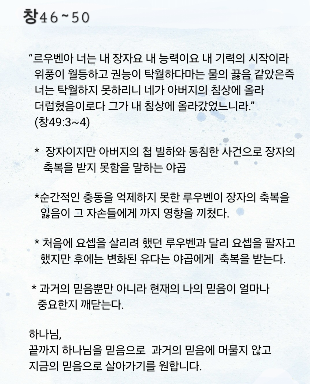 너는 탁월하지 못하리니 네가 아버지의 침상에 올라 더럽혔음이로다 그가 내 침상에 올라갔었느니라.”(창49:3~4)