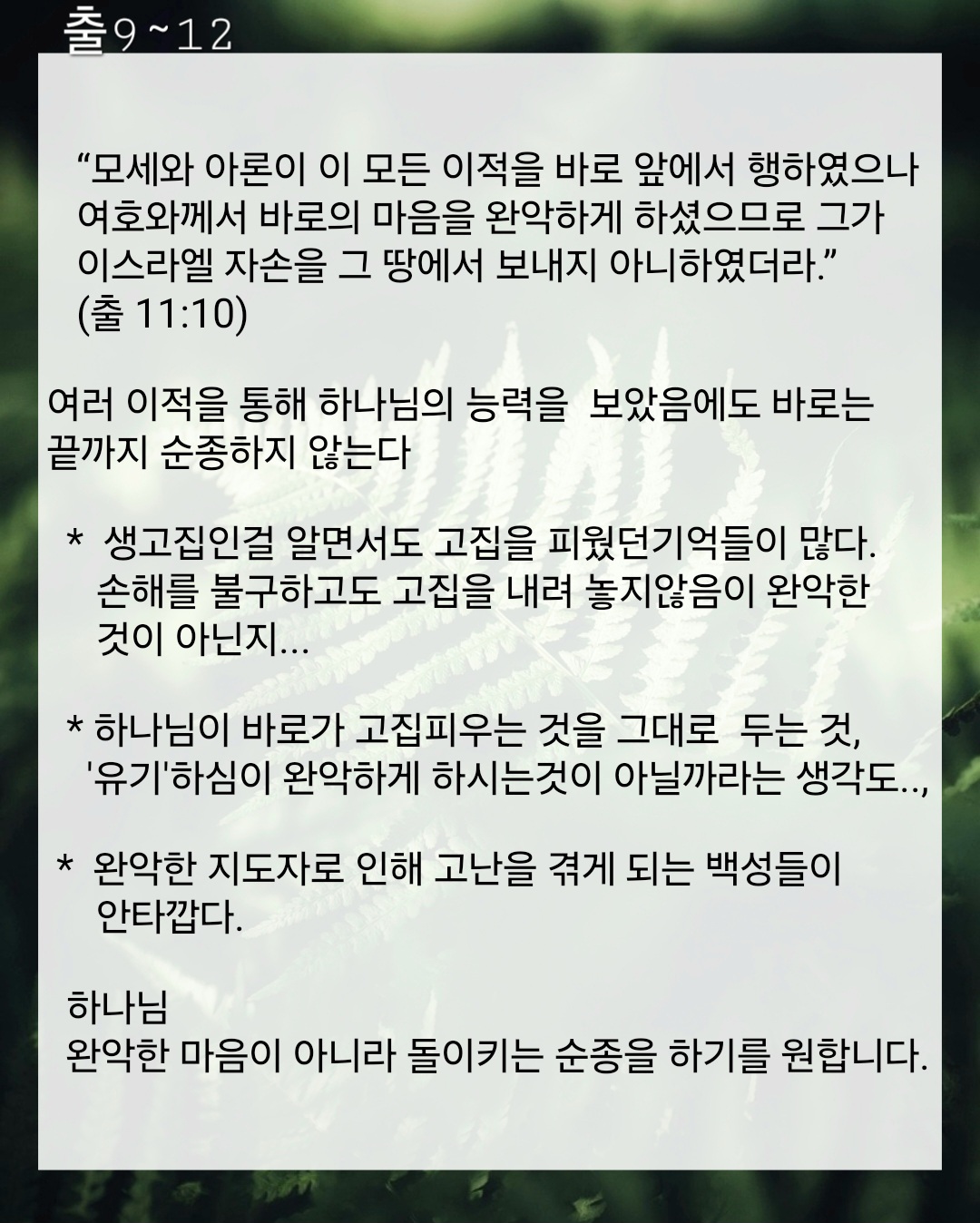 “모세와 아론이 이 모든 이적을 바로 앞에서 행하였으나 여호와께서 바로의 마음을 완악하게 하셨으므로 그가 이스라엘 자손을 그 땅에서 보내지 아니하였더라.”(출 11:10)